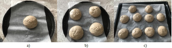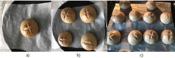 Для подтверждения экспериментальных расчетов было приготовлено тесто по рецептуре указанного выше ресторана: выпечка одного образца (рис. 4а), четырех образцов (рис. 4b) и десяти образцов (рис. 4c).