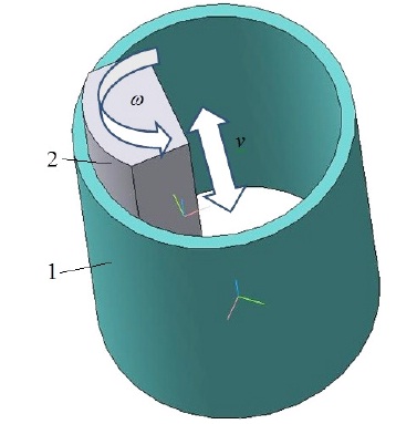 После этого на подготовленные образцы наносилось хромовое покрытие. Кинематика движения инструмента при нанесении покрытия на внутреннюю цилиндрическую поверхность представляет собой сочетание двух видов движения: ω – вращательное движение инструмента вокруг оси симметрии и υ – возвратно-поступательное движение вдоль внешней стороны образующей цилиндрического тела (рис. 4).
