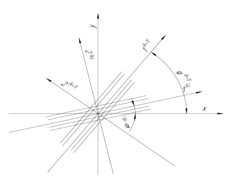 Оценку модуля упругости композитного материала, нанесенного способом ГКО, рассмотрим на примере многослойного покрытия, состоящего из однонаправленных и не согласованных между собой по ориентации элементарных слоев. В ходе расчетов будем использовать общую, «глобальную», систему координат (х, у) и местные локальные однонаправленные слои в сопутствующей системе координат (1(k), 2(k)) (рис. 7) [19].