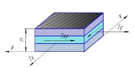 где σxy – напряжения в единичных слоях, МПа; Ḡ – коэффициент жесткости, Н/м; εxy – относительные деформации слоев.