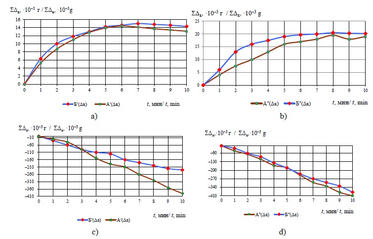 Экспериментально полученные кривые массопереноса ΣΔк при ЭИЛ стали 45 анодными материалами с режимами Аʹ, Бʹ, Аʺ, Бʺ относятся к классу «кривых Лазаренко» (рис. 3a, 3b) [2; 6]. Наибольшие значения величины массопереноса ΣΔк наблюдались при t = 6–8 мин при ЭИЛ удельной площади поверхности 1 см2, после чего до t = 10 мин процесс ЭИЛ стабилизировался и прироста ΣΔк не наблюдалось.