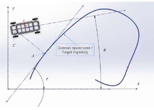 Введем следующие обозначения: C – текущая позиция робота; A – ближайшая к ней точка на целевой траектории; O – мгновенный центр кривизны целевой траектории в точке A; OA = R(s) = 1/s; k(s) – значение кривизны траектории в точке A; τ – угол между касательной к траектории в точке A и осью x, и ψ = θ – τ [20].