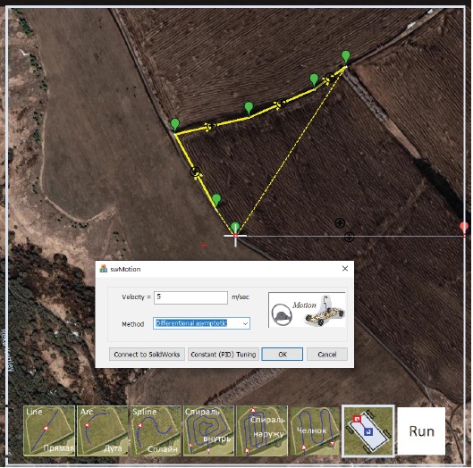 Программный модуль представляет собой многодокументное Windows-приложение архитектуры «документ-вид» (среда разработки MS VisualStudio C++/MFC/COM/vMicro(Arduino)/APISolidWorks) и развивает опыт авторов в разработке приложений данного типа10 [31; 32]. В окне вида отображается масштабированная карта местности, полученная с геоинформационных систем или наземных станций управления и предназначенная для планирования траектории движения робота.