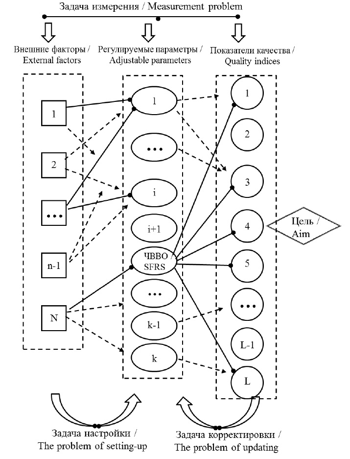 В иерархии решения задачи оперативной корректировки технологических регулировок первый уровень занимает выявление причин нарушений качества работы. Система взаимосвязей между внешними признаками нарушения процесса уборки урожая, причинами, приводящими к этим признакам, и способами устранения нарушений носит сложный, не всегда однозначный характер. В результате исследований установлена идентификация взаимосвязей, указано 40 внешних признаков нарушения технологического процесса [13]. Как правило, появление нарушения показателя техпроцесса обусловлено влиянием 5 и более регулировочных параметров, а также параметров технического состояния агрегата или рабочего органа. Наличие двух групп факторов, между которыми существует неоднозначная система взаимосвязей, усложняет задачу технологической корректировки.