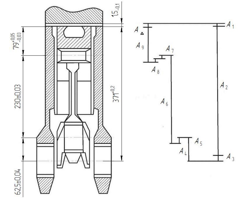 где A1...A2 – составляющие звенья (знак «–» указывает, что звенья уменьшающие; «+» – увеличивающие); A1 – толщина прокладки, A1 = 1,5−0,1 мм [5]; A2 – расстояние от оси коренных опор в блоке до привалочной плоскости с головкой блока, по чертежу мм, допустимый мм; A3 – зазор в сопряжении коленчатый вал – подшипник коренной, по чертежу мм, допустимый мм; A4 – радиус кривошипа, мм; A5 – зазор в сопряжении вкладыш шатуна – коленчатый вал, по чертежу мм, допустимый мм; A6 – расстояние между осями отверстий верхней и нижней головок шатуна, мм; A7 – зазор в сопряжении втулка шатуна – поршневой палец, по чертежу мм, допустимая мм; A8 – зазор в сопряжении поршневой палец – бобышка поршня, мм; A9 – расстояние от оси отверстия под палец до верхнего торца поршня, мм.