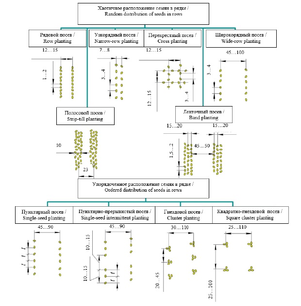Растения размещаются на поле, а значит, форма и площадь их питания формируются различными способами посева. По нахождению семян в рядке можно выделить посевы с хаотичным и упорядоченным расположением. Схемы и размерные характеристики способов посева, выраженные в сантиметрах, представлены на рисунке 1.