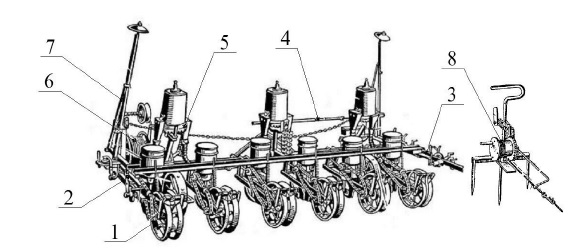 5 – туковысевающая система; 6 – катушка с мерной проволокой; 7 – маркер; 8 – натяжная станция