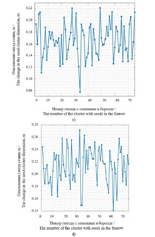 Установлено, что точность распределения гнезд семян на поле определяется в большей степени скоростью сеялки, чем настройками измерительного устройства, так как отклонение гнезд семян под влиянием скорости посевного агрегата (х = 0,078 ‒ 0,243 м при v = 2,5 м/с) на порядок превышает отклонения (ΔL = 2,7 ∙ 10–3 м при x = 0,3 м, v = 2,5 м/с), определяемые настройками энкодера путеизмерительного колеса и алгоритмом управления. Поэтому возникает необходимость в снижении скорости сеялки для уменьшения разброса семян в борозде. Но это ведет к нивелированию достоинств квадратно-гнездового размещения семян и необходимости поиска способа повышения качества работы заделывающих органов сеялки для снижения разброса и фиксации семян в борозде на высоких скоростях посева.