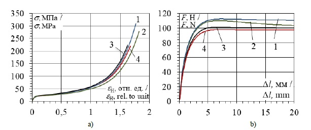 Значения начального Ен и конечного Ек модулей упругости (МПа) определяли как тангенсы угла наклона касательных соответственно к начальному и конечному прямолинейным участкам кривых σ = f(εН). Значения пределов вынужденной эластичности и предела прочности принимали равными соответственно условному пределу текучести (ГОСТ 11262-2017) и максимальному значению достигнутого напряжения» [26].