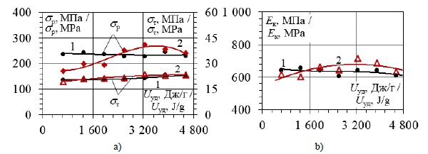 На рисунке 2 представлены полученные зависимости физико-механических характеристик образцов пластин СВМПЭ и нанокомпозита СВМПЭ + 0,1 % УНТ от удельных энергозатрат на механоактивацию порошков.
