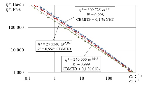 На рисунке 3 представлены частотные зависимости комплексной вязкости η* расплавов нанокомпозитов для трех составов при оптимальном значении энергозатрат на механоактивацию. Результаты в диапазоне четырех порядков изменения угловой скорости ротора реометра описываются с коэффициентом корреляции не ниже 0,99 степенной зависимостью Оствальда – де Ваале: