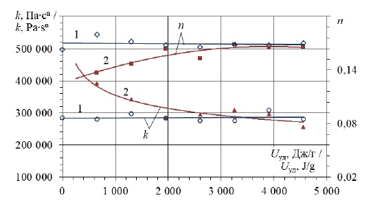 На рисунке 4 представлена зависимость параметров реологической модели Оствальда – де Ваале от удельных энергозатрат на механоактивацию в шаровой мельнице порошков СВМПЭ (1) и СВМПЭ + 0,1 % УНТ (2).