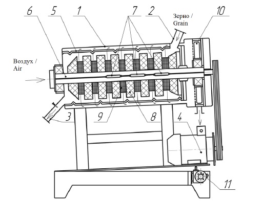 Fig. 1. Horizontal peeling-drying machine: 1 – case; 2 – inlet;