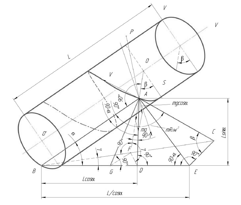 Введем обозначения: АВ – линия, проходящая через точку А положения частицы на высштамповке ситового цилиндра, определяемая углом наклона высштамповки β; ВСЕ – горизонтальная плоскость; АD ┴ ВЕ, АВЕ – вертикальная плоскость; AOVV – плоскость вращения цилиндра; АС – касательная к окружности цилиндра; АЕ – перпендикуляр к линии АВ; BC – след касательной плоскости на основание; δ – угол следа касательной плоскости со следом ВЕ вертикальной плоскости; γ – угол наибольшего ската в точке, то есть двухгранный угол между касательной плоскостью АВС и плоскостью основания ВСЕ; AD – перпендикуляр, опущенный из точки А на линию ВЕ; GA – проекция линии наибольшего ската на вертикальную плоскость; L – длина цилиндра от его начала до плоскости сечения, мм; α – угол наклона цилиндра.