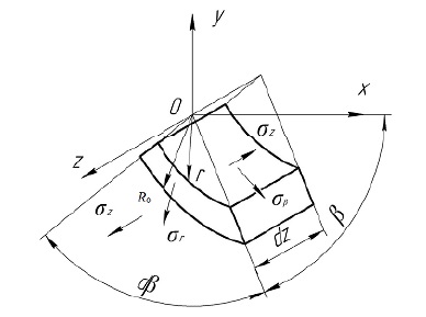 Для установившегося режима действующей шелушильно-сушильной машины угол наклона машины α и высштамповки ситового цилиндра β существенно влияют на расход электрической энергии на процесс обработки зерна. Интенсивность шелушения зерна в рабочем кольцевом зазоре машины зависит в большей степени от модулей нормальных и касательных сил, приложенных к зерновкам в результате их трения о рабочие органы машины (абразивные диски и ситовой цилиндр), при этом зерновки подвергаются действию тангенциальных σβ, радиальных σr и осевых напряжений σz, обеспечивающих эффективное шелушение зерна (рис 4). При этом следует также иметь в виду, что существуют факторы, влияющие на эффективность шелушения, учитывание которых создает затруднения для комплексного описания исследуемого процесса. К ним относятся такие факторы, как увеличивающееся в функции времени количество отделенных оболочек, создающих условия для изменения коэффициентов внутреннего и внешнего трения смеси зерна с продуктами шелушения; коэффициент заполнения рабочей зоны машины, определяющий плотность укладки зерновой массы; количество аспирируемого воздуха и его относительная влажность и т. д.