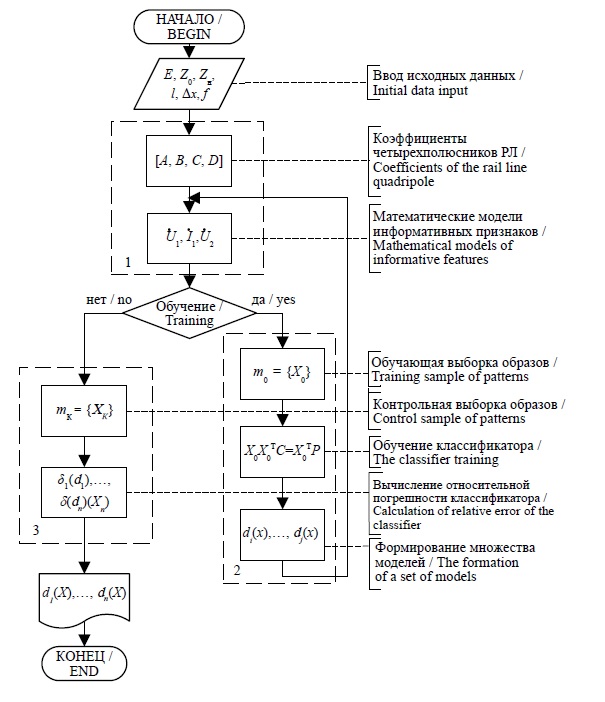 Определение коэффициентов моделей (2), (4), (6) осуществляется принципом многомерной аппроксимации, когда на первом этапе формируются пространства классов состояний с обучающей выборкой образов [X]0 и априорно определенными показателями классов Pijk, а на втором этапе проверяется правильность распознавания классов использованием контрольной выборки образов [X]k с оценкой качества классификации [6; 31; 32]. Так как при классификации состояний РЛ априорная совокупность классов состояний заранее известна (классы образов режимов нормального PN, шунтового PS и контрольного PK), то обучение модели относится к задаче «обучение с учителем». На рисунке 4 представлена блок-схема алгоритма формирования адекватных моделей, включая обучение классификатора.