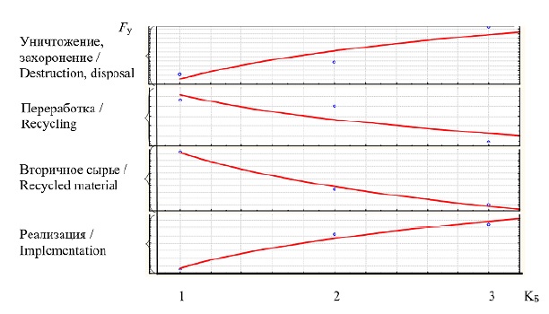 Между показателем утилизируемости и показателем сложности технического исполнения при проведении утилизации на разных этапах ее осуществления определены закономерные связи, представленные на рисунке 2.