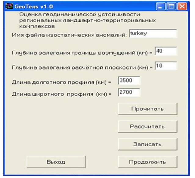 После запуска программа запрашивает имя файла изостатических аномалий, которое нужно обязательно ввести, поскольку именно в этом файле в формате системы GEOGRID размещена информация о внешней вертикальной нагрузке, действующей на среду РПТС. Также необходимо ввести глубины (в км), на которых расположены условная граница возмущений и расчетная плоскость. После ввода с клавиатуры длин (в км) долготного и широтного профилей необходимо нажать на кнопку «Прочитать». При этом происходит считывание данных из файла изостатических аномалий, и программа готова к выполнению расчетов. Расчеты производятся после нажатия на кнопку «Рассчитать».