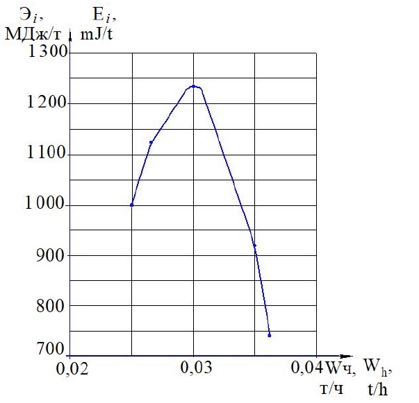 Зависимость энергоемкости технологического процесса Эi от часовой производительности Wч экспериментальной установки представлена на рис. 6.