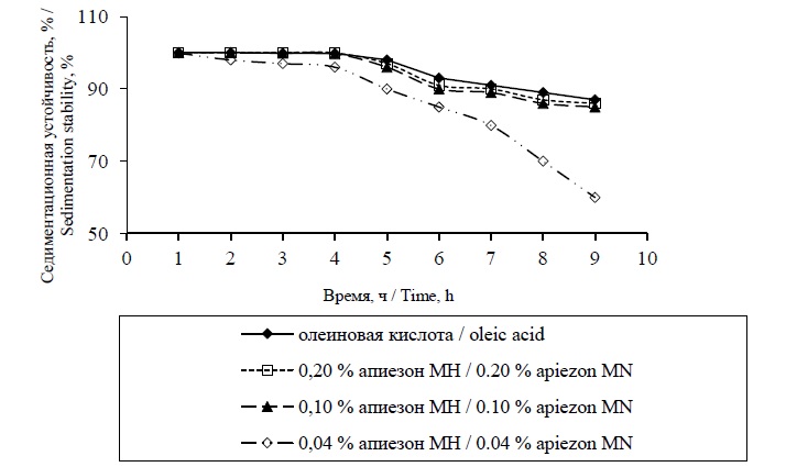 При использовании в качестве стабилизатора апиезона МН получен положительный результат. Седиментационная устойчивость суспензии оказалась на уровне эталона (олеиновой кислоты).