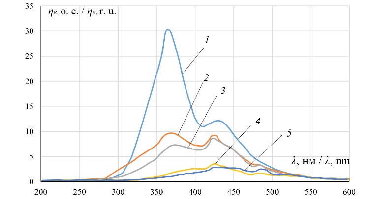 Для коротковолнового (λmax = 362 нм), средневолнового (λmax = 424 нм) и длинноволнового (λmax = 485 нм) пиков рассчитаны интегральные значения Н в рабочих диапазонах возбуждения: 250–410 нм, 410–470 нм и 470–550 нм соответственно. Результаты представлены в табл. 1, причем интегральные значения средневолнового возбуждения приняты за единицу, и относительно них пересчитаны значения параметров для коротковолновых и длинноволновых диапазонов (в знаменателе).
