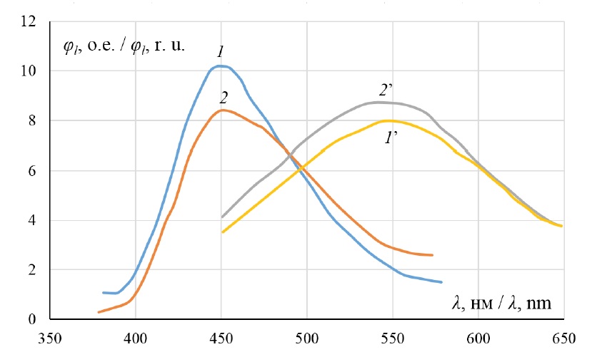 Fig. 2. The luminescence spectra of milky ripeness (1 and 1’) and fully ripe (2 and 2’) wheat seeds