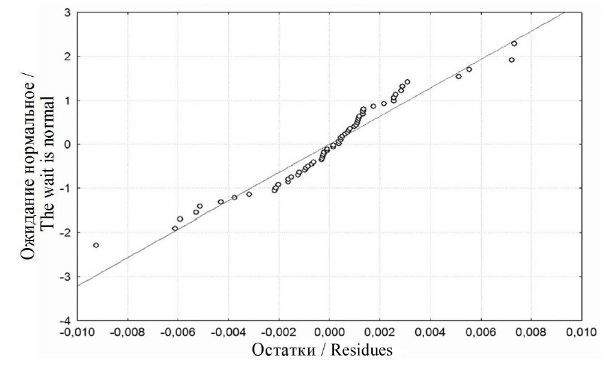 Для дальнейшей проверки адекватности модели (2) рассмотрим график распределения остатков (рис. 5), из которого видно, что они достаточно хорошо аппроксимируются нормальным распределением.