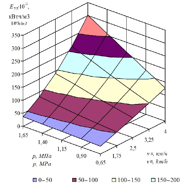 Аналогично анализируя график удельной энергоемкости Eуд (рис. 2), можно сделать выводы, что в указанных пределах изменения твердости почвы и скорости движения пахотного агрегата значение Eуд изменяется в пределах от 28,7·10-3 до 301,6·10-3 кВт·ч/м3. При этом, как в случае с требуемой мощностью двигателя, с увеличением скорости движения мотоблока наблюдается более интенсивный рост значений энергоемкости процесса обработки почвы.