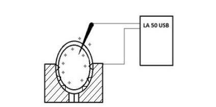 В процессе измерения каждое семя пшеницы помещалось в электрод и протыкалось вторым электродом. Регистрация сигнала происходила с помощью устройства LA 50 USB. Запись сигнала во времени осуществлялась на протяжении 10 с. На рисунке 2 представлена схема подключения электродов.