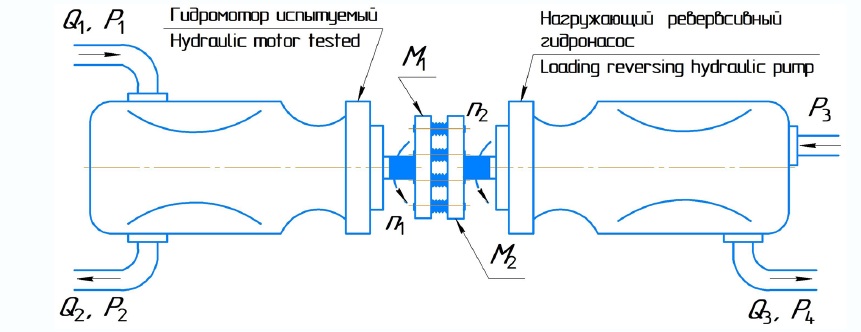 Согласно схеме испытания с использованием предлагаемого гидравлического метода нагружения (рис. 1) валы испытуемого гидромотора и нагружающего реверсивного гидронасоса соединены между собой жесткой муфтой. Поэтому частоты их вращения равны n1 = n2, также равны развиваемый и приводной моменты испытуемого гидромотора и реверсивного гидронасоса, то есть М1 = М2.