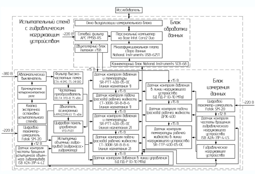 В блоке измерения данных использовалось следующее оборудование: трехфазный асинхронный электродвигатель 4АМН225М4У3 (75 кВт), частотный преобразователь DELTA VFD-B (75 кВт/380 В), реверсивные дроссели-расходомеры CT-300R-SR-B-B-6 (Webtec), испытуемый гидропривод, реверсивный гидронасос 310.3.112, индуктивные датчики контроля частоты вращения вала гидронасоса, гидромотора и нагружающего устройства ISB A2A-31P-4-LZ, аналоговые датчики давления и температуры SR-PTT-400-05-0C (Webtec), портативное считывающее устройство HPM-540-05-0C с комплектом аналоговых кабелей SR-CBL-003-55-MM (Webtec). Рама стенда с гидравлическим нагружающим устройством и соединительные муфты были изготовлены индивидуально.