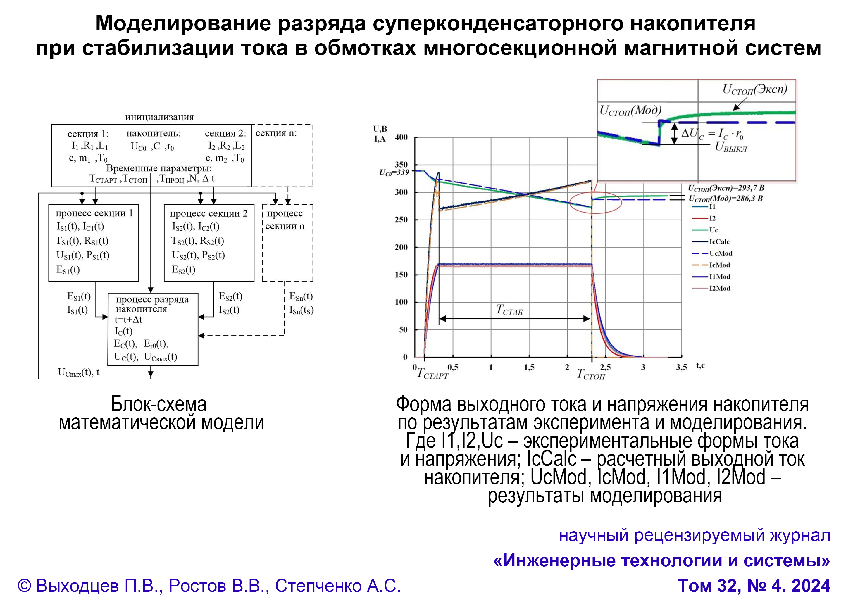 Обсуждение и заключение. Небольшое отличие в результатах объясняется отклонением реальных параметров накопителя от паспортных значений, а также различием температуры обмоток в эксперименте и моделировании. Использование энергетического баланса для расчета выходного напряжения накопителя позволяет масштабировать нагрузку путем добавления любого количества потребителей энергии с независимой стабилизацией тока в каждом.
