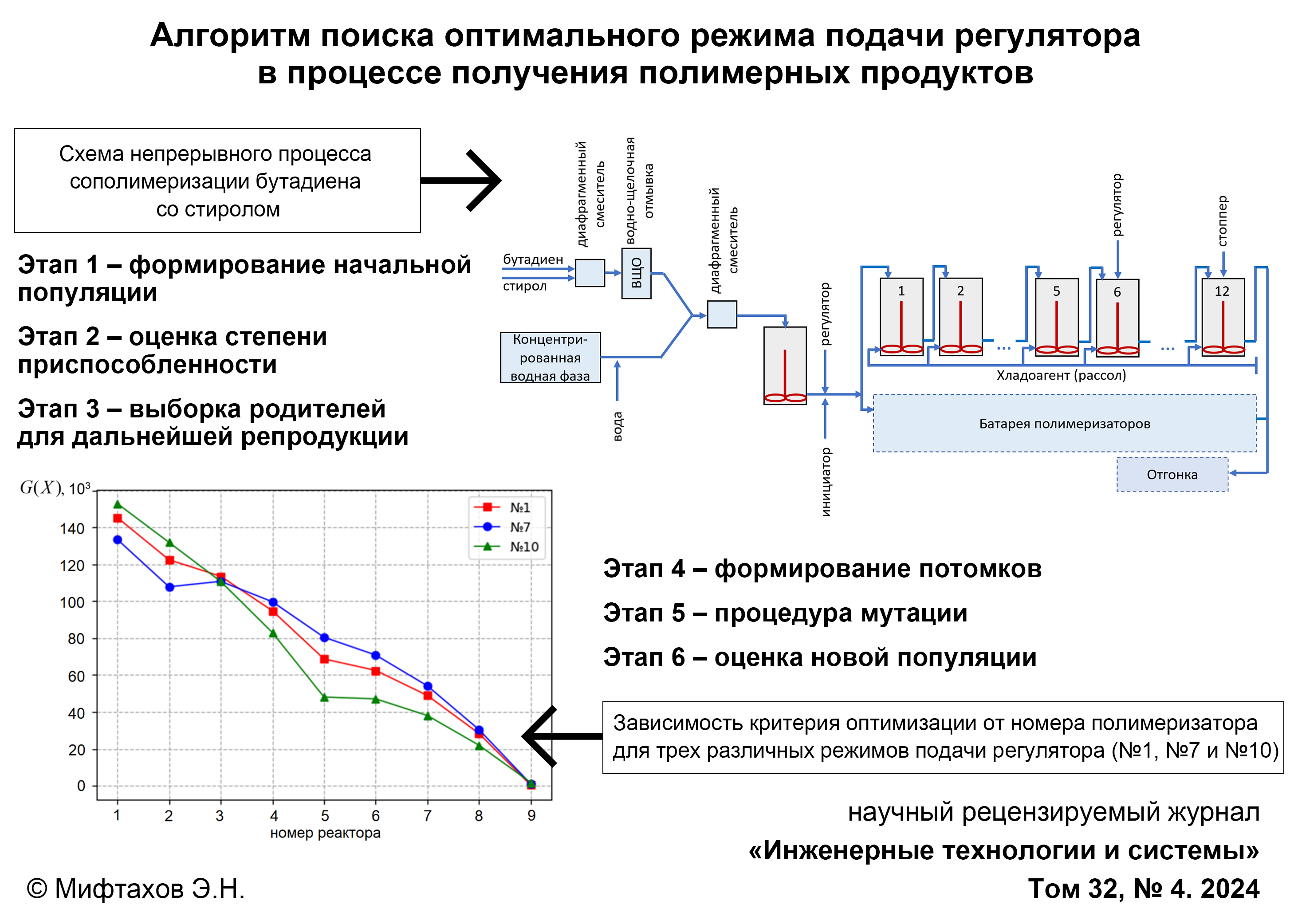 Материалы и методы. Для решения задачи поиска оптимального режима подачи регулятора используется эвристический подход, представленный генетическим алгоритмом оптимизации. Данный алгоритм основан на механизме создания популяции потенциальных решений, которые подвергаются операциям скрещивания, мутации и отбора, имитируя процессы наследования и эволюции в природе. С целью оценки молекулярных характеристик продукта сополимеризации применяется кинетический подход к моделированию, основанный на использовании моментов молекулярно-массового распределения. Для математического описания непрерывного производства используются рекуррентные соотношения, характеризующие перенос реакционной массы между реакторами идеального перемешивания.
