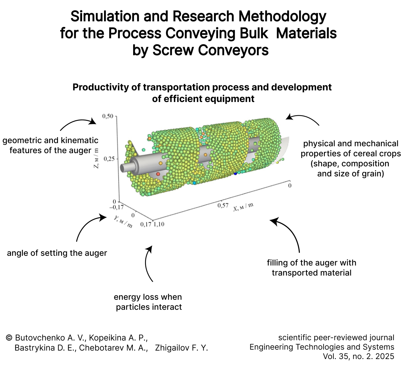 Introduction. Increase in the performance of modern agricultural machines is not possible without the use of more powerful conveying working tools. In this regard, one of the topical problems of mechanical engineering is the development of conveying working tools not only with high performance, but also with optimal geometric parameters affecting the conveying process. However, there is no validated methodology for simulation and evaluation of the efficiency of bulk material movement by screws conveyors, which would allow determining the most optimal design variant at the design stage.