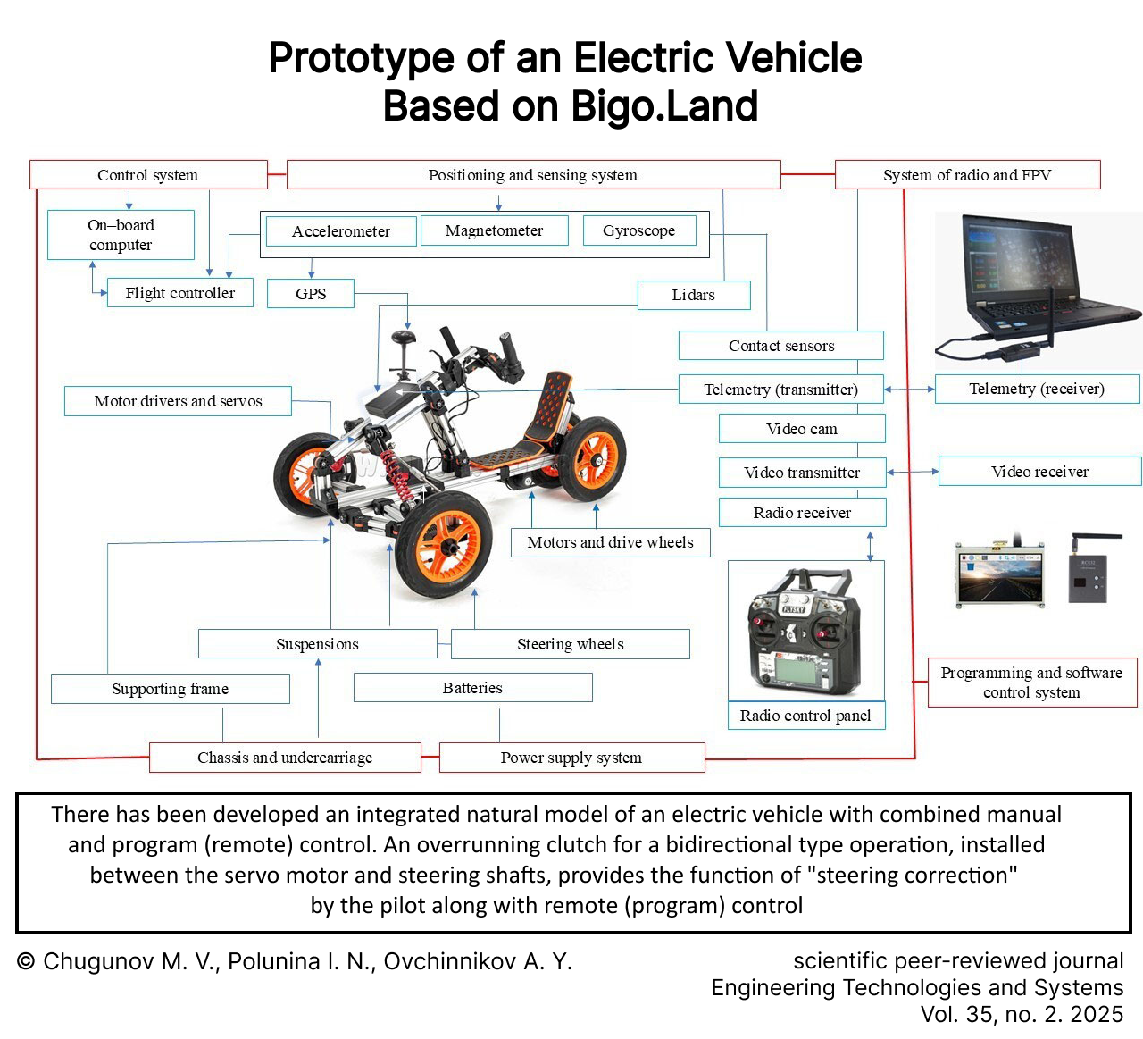 Introduction. Modern electric vehicle industry is actively developing in many areas. Developing design and implementing a design decision for an electric vehicle are urgent tasks, including many specific interconnected research, design and technological problems. This article discusses a prototype electric vehicle, in which there is implemented a design decision based on combined control, which includes manual, remote and program control.