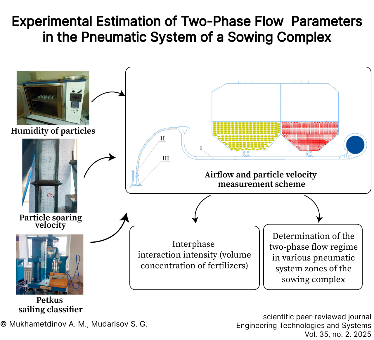 Aim of the Study. The aim is to estimate experimentally the parameters of two-phase flows in the pneumatic system of a sowing complex, where an air stream is used as the carrier phase and a mixture of solid particles of fertilizer granules is used as the dispersed phase.