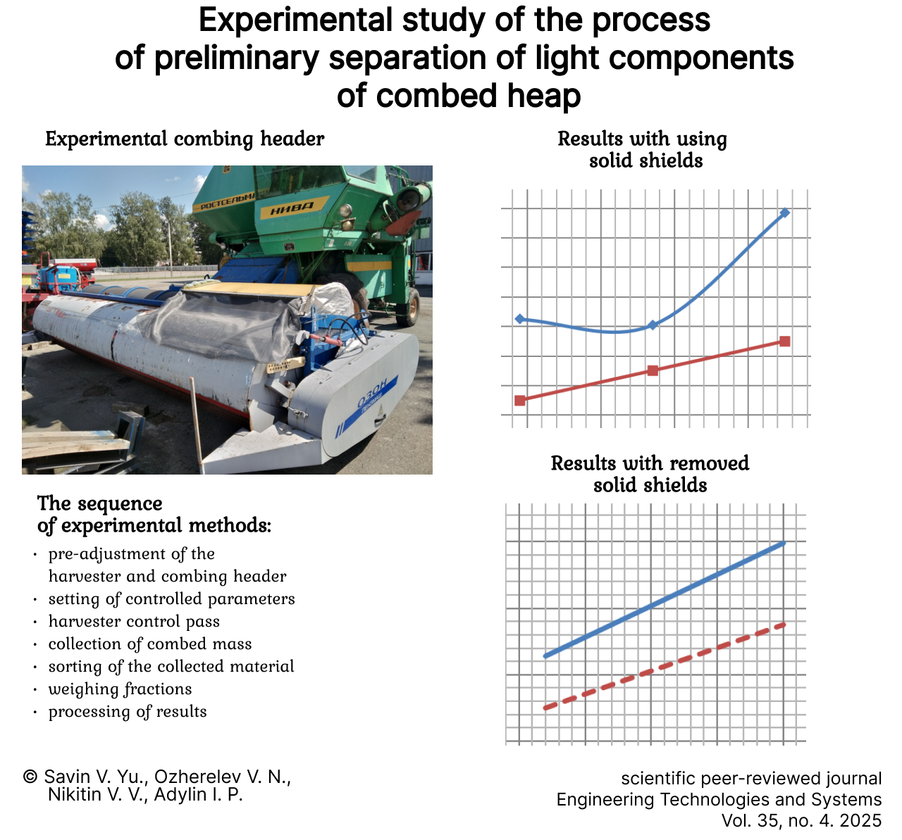 header with preliminary separation of light impurities. During the experiment, the height of the stripper header outlet was varied. The mass of the separated chaff and its composition were determined. When processing the experimental data, there were obtained relationships meeting the study objectives. The results are divided into two groups: the results with the use of solid shields installed on the combing header rear wall and those without solid shields, when the rear wall is a mesh surface.
