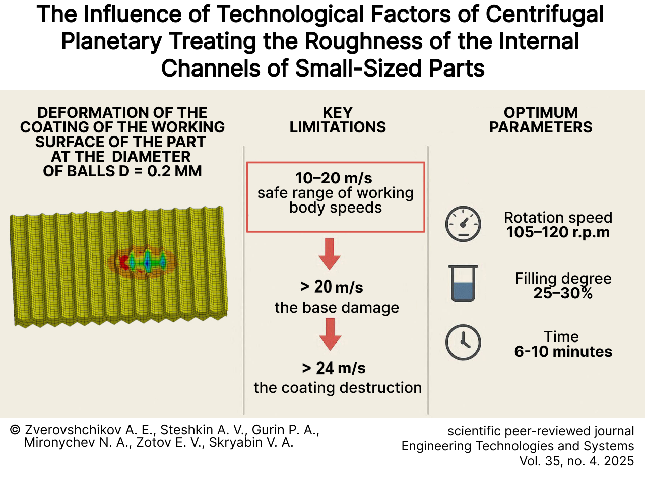 Materials and Methods. To determine the range of equipment technological characteristics, there was used the developed program “Channel”, the initial data for which were calculated using computer simulation of contact interaction in the software package ANSYS WORKBENCH. Experimental studies were carried out on the installation D7H.650.00.00. There were used the samples of small-sized brass parts DKRNT 30 ND L63 GOST 2060-2006 with silver electroplated coating. CHRONITAL – CAST Stainless Steel Shot by the firm Vulkan Inox Gmbh (Germany) was used as working material.