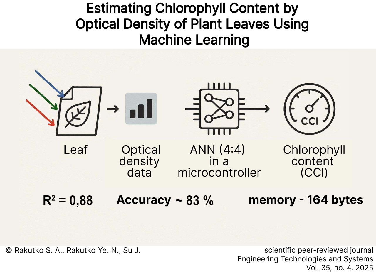 from 0.57 to 2.54 relative units (red), from 0.9 to 1.66 relative units (green), and from 1.09 to 3.53 relative units (blue). According to these data, the chlorophyll content variations are from 3.1 to 156.5 relative units. In the study, there were compared six artificial neural network architectures that differed by hidden-layer neurons. The structure “32:32” had the highest accuracy (MAE = 6.64 rel. units, MAPE = 16.34%, R² = 0.8886). A simplified structure “4:4” was selected to simplify the model and improve the microcontroller efficiency. This structure maintained the performance (MAE = 6.83 rel. units, MAPE = 16.86%, R² = 0.8808) with much smaller amount of resources used – 41 weight parameters and 164 bytes of memory. A comparative evaluation with classical machine learning algorithms demonstrated the superiority of the developed model across all metrics.
