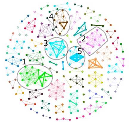Рис. 3. Топ-5 крупных кластеров по мере Modularity class