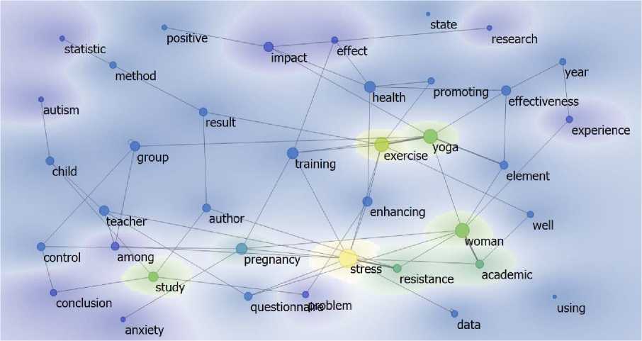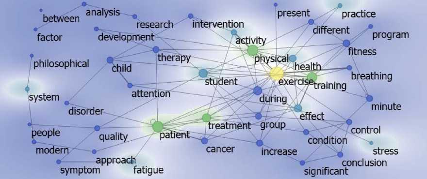 В ходе исследования был проведен анализ ключевых слов в выгруженных аннотациях. Самыми часто употребляемыми словами являются: yoga, exercise, study (два значения − исследование и учение), physical, training, patient, treatment, group, health, practice (рис. ). Вокруг ключевых слов, обладающих высокой статистической значимостью, выстраивается сеть взаимосвязей со словами, обладающими меньшей статистической значимостью и встречающимися в текстах реже.