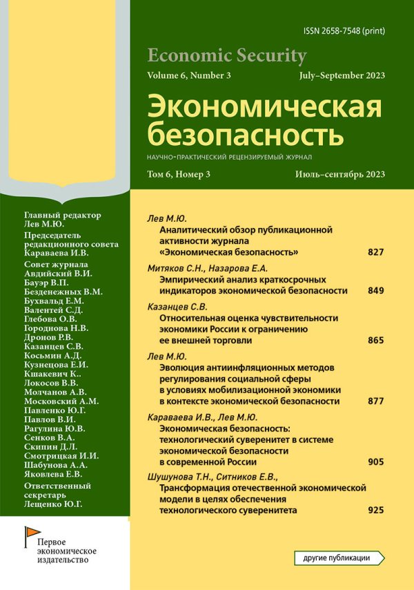 The article presents the materials of the All-Russian Scientific and Practical Conference “The 7th Senchagov Readings” on the topic “Russia's economic security: responding to new challenge” for scientists, specialists, academic staff and postgraduates, held in Moscow on March 23-24, 2023 in full–time and ZOOM format on the basis of the Institute of Economics of the Russian Academy of Sciences and with the organizational and scientific participation of the Financial University under the Government of the Russian Federation, V.Ya. Kikot' Moscow University of the Ministry of Internal Affairs of the Russian Federation, St. Petersburg State University of Economics, Nizhny Novgorod State Technical University named after R.E. Alekseev, Section of Problems of Macroeconomics and Social Market Economy of the Russian Academy of Natural Sciences and the Journal "Economic Security". The main directions of the forum discussion on the sectional direction "Technological sovereignty in the system of economic security of modern Russia" are highlighted. Promising areas of research in the field of economic security and the development of anti-sanctions policy are particularized. The article is based on the results of the All-Russian Scientific and Practical Conference “The 7th Senchagov Readings” on the topic “Russia's economic security: responding to new challenge”.The article has been prepared in accordance with the topic of the state task Reg. No. RD 121030500096-5; Reg. No. ICRBS "New challenges and threats to socio-economic security: measures of budgetary and financial regulation".