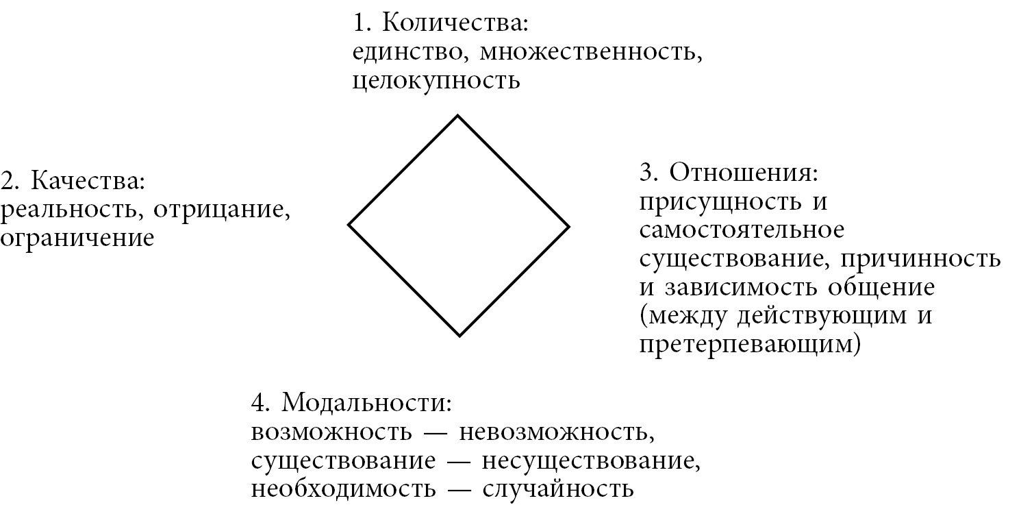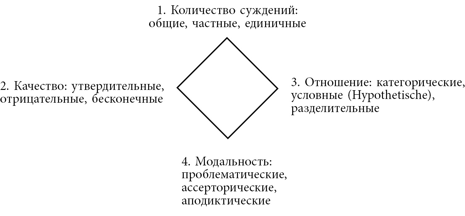 Кант пишет в разделе «Антиномия чистого разума»: «…Всякая трансцендентальная видимость чистого разума основывается на диалектических выводах, схему которых дает логика в трех своих формальных видах умозаключений вообще, подобно тому как категории имеют свою логическую схему в четырех функциях всех суждений». (Курсив мой — Э.Т.) Второй книги трансцендентальной диалектики Глава вторая [1, c. 327–328]. Однако для трех из четырех своих классов высказываний Кант оставляет номенклатуру, или названия, именно аристотелевских категорий — разумеется, с пассажами через Порфирия, Боэция, схоластику и т. д. В то же время «количество», «качество» и «отношение» означают для Аристотеля и Канта разные домены, а точнее, разные способы мыслительных действий. Преподавая формальную логику в университетах, мы делим суждения в основном так же, как их разделил Кант.