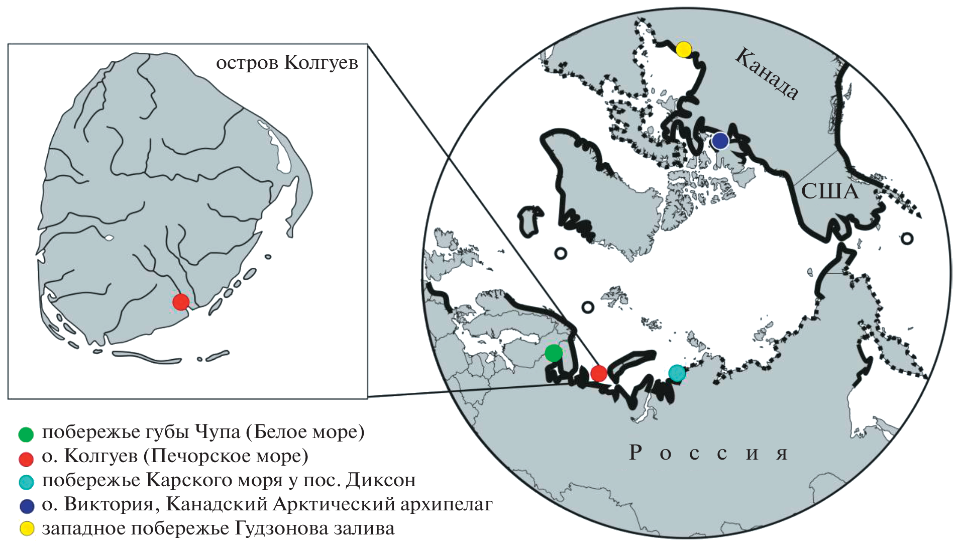 Генетические особенности орибатид вида Ameronothrus nigrofemoratus, обитающих циркумполярно на побережье арктических морей, до настоящего времени были известны только для клещей с территории Канады. Изучение частичной последовательности COI мтДНК особей, соответствующих данному виду по морфологическим признакам, показало, что на о. Колгуев совместно обитают клещи, относящиеся к двум сильно дивергировавшим филогенетическим линиям (7%), ни одна из которых на побережье Канады не обнаружена. Аминокислотная последовательность цитохромоксидазы I представителей одной из линий имеет четыре замены по сравнению с последовательностью североамериканских A. nigrofemoratus, что соответствует уровню различий между A. nigrofemoratus и сестринским видом A. lineatus.