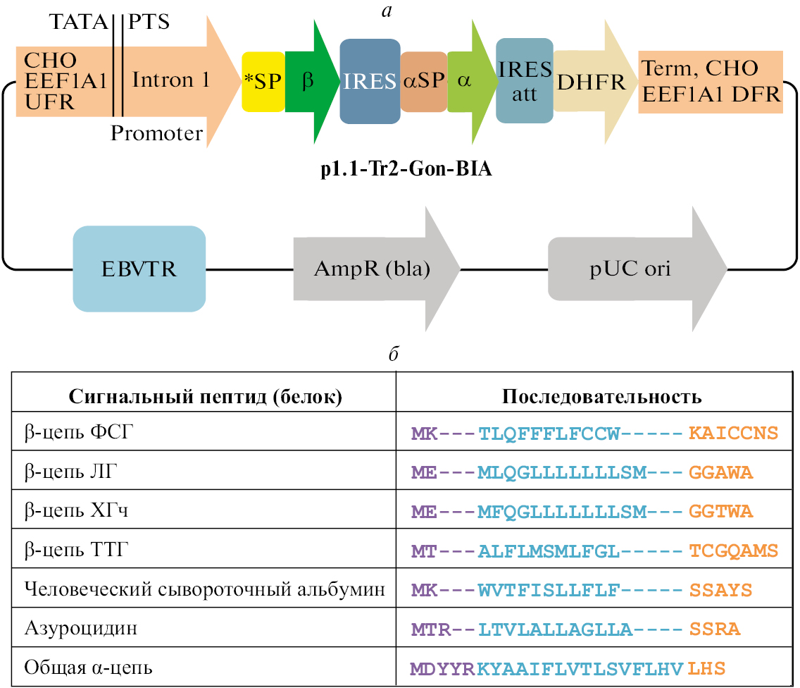 Рис. 1. Карта трицистронных экспрессионных плазмид, кодирующих цепи гликопротеиновых гормонов, и последовательности сигнальных пептидов. (а) Карта плазмид, обозначения: pUC origin – область начала репликации плазмиды pUC; bla – открытая рамка считывания бета-лактамазы; EBVTR – участок терминального повтора вируса Эпштейн-Барр человека; CHO EEF1A1 UFR и CHO EEF1A1 DFR – районы, фланкирующие ген EEF1A1 китайского хомячка, содержат промотор, интрон, терминатор и сигнал полиаденилирования гена EEF1A1; TATA – TATA-бокс; PTS – предполагаемая точка начала транскрипции; IRES – природный внутренний сайт связывания рибосом EMCV дикого типа; IRES att – аттенюированный внутренний сайт связывания рибосом; *SP – варьируемый сигнальный пептид β-цепи; β – OPC β-цепи соответствующего гормона; αSP – сигнальный пептид α-цепи гликопротеиновых гормонов; α – OPC α-цепи; DHFR – ОРС дигидрофолатредуктазы мыши. (а) Последовательности сигнальных пептидов, фиолетовым шрифтом выделена N-область по данным алгоритма SignalP 6.0, голубым шрифтом – H-область, оранжевым – C-область.
