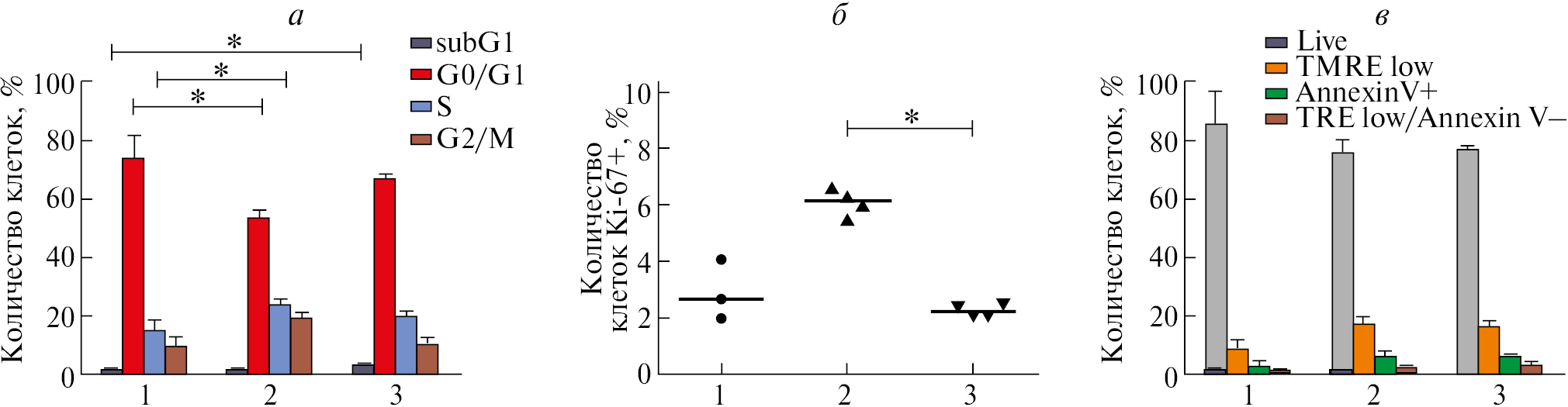 Рис. 3. Основные параметры пролиферации и клеточной гибели в клеточной линии рака простаты LNCaP 3 в контроле (1), при гиперэкспрессии изоформы А миозина 1С (2) и при гиперэкспрессии изоформы С миозина 1С (3). а – гистограммы распределения клеток по клеточному циклу. б – представленность Ki‑67+ клеток в образцах. в – гистограммы распределения клеток по стадиям клеточной гибели. Приведено 3 независимых эксперимента, * – достоверные различия между группами, р < 0.05, тест Краскелла–Уоллиса, пост-тест Данна.
