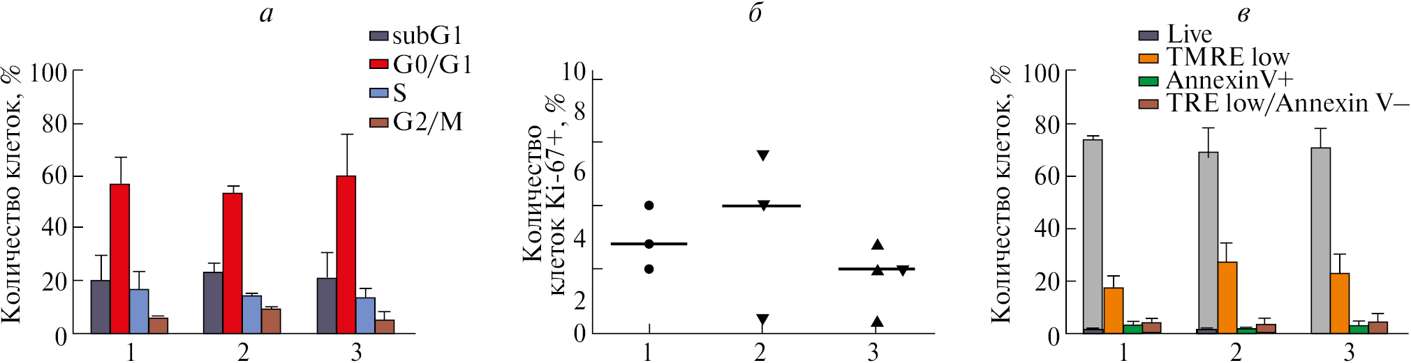 Данные проточной цитометрии анализировали в программе Diva 6.2.1 (BD Biosciences, США). При анализе данных субпопуляции, соответствующие разным фазам клеточного цикла, выделялись автоматически при помощи ПО ModFit LT 3.3. Построение графиков и анализ проводились в программе GraphPad Prism 8. Для статистического анализа различий использовали критерий Краскела-Уоллиса. Различия считали статистически значимыми при p < 0.05.