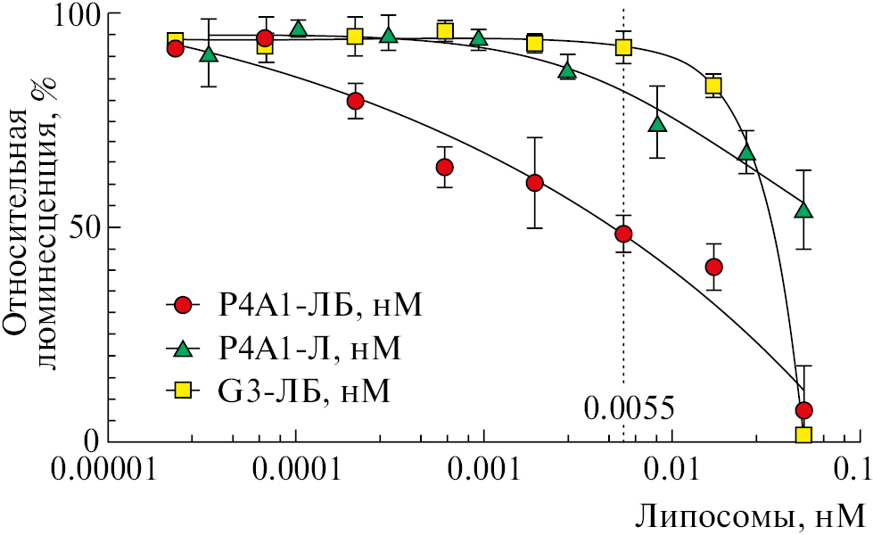 Все три исследуемых препарата демонстрируют нейтрализующую активность, обусловленную, по-видимому, разной природой (рис. 2). В случае препарата G3-ЛБ, имеющего в качестве направляющей молекулы пептид G3, не обладающего способностью связываться с S-белком SARS-CoV-2, нейтрализующая активность проявляется при концентрации липосом более 0.0055 нМ. Этот эффект, возможно, реализуется за счет неспецифического связывания липосомальных частиц с поверхностью псевдовирусов и/или клеток и дальнейшего слияния с ними. Барназа, высвобождающаяся после слияния, проявляет РНКазную активность в отношении вирусного генома в составе псевдовирусов и/или цитоплазматической РНК зараженных клеток, что приводит к снижению синтеза маркерного белка люциферазы. Для исключения возможного объяснения наблюдаемого падения люминесценции гибелью клеток вследствие цитотоксического эффекта неспецифической интернализации липосом, содержащих барназу, мы изучили изменения жизнеспособности клеток линии HEK293T-ACE2, обработанных и необработанных препаратами G3-ЛБ, P4A1-ЛБ и P4A1-Л, с использованием стандартного МТТ-теста [11]. Полученные данные не выявили статистической разницы в жизнеспособности клеток линии HEK293T-ACE2 между обработанными и необработанными клетками для всех исследуемых препаратов, что свидетельствует об отсутствии значимого цитотоксического действия исследуемых липосомальных препаратов в диапазоне концентраций 0–0.05 нМ.
