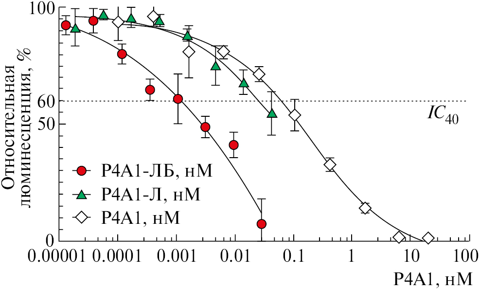 В случае препарата P4A1-Л, не содержащего барназу, нейтрализующая активность обусловлена концентрационно-зависимым блокированием антителом P4A1 S-белка SARS-CoV-2 на поверхности псевдовирусов, что в свою очередь препятствует взаимодействию с рецептором ACE2 и дальнейшему проникновению псевдовирусов в клетки. В случае препарата P4A1-ЛБ мы можем предположить, что нейтрализующая активность достигается за счет синергического эффекта, обусловленного концентрационно-зависимым блокированием проникновения псевдовирусов, как в случае препарата P4A1-Л, так и РНК-азной активности барназы, как в случае препарата G3-ЛБ. Для корректного сравнения нейтрализующей активности полученных липосомальных препаратов P4A1-ЛБ и P4A1-Л определяли концентрацию конъюгированного антитела P4A1 в составе препаратов методом ИФА. Поскольку для препарата P4A1-ЛБ значения люминесценции для концентраций P4A1 выше 0.0028 нМ, соответствующих концентрациям липосом более 0.0055 нМ, могут быть занижены вследствие влияния неспецифической интернализации барназы, то сравнение нейтрализующей активности проводили, определяя ингибирующую концентрацию 40 % (IC40). Согласно полученным данным (рис. 3) нейтрализующая активность липосомальных препаратов P4A1-Л и P4A1-ЛБ (IC40 17 ± 9 и 1.2 ± 0.9 рМ соответственно) выше таковой свободного антитела P4A1 (IC40 55 ± 6 рМ). Эти данные позволяют сделать вывод о том, что липосомальные частицы вносят значительный вклад в нейтрализацию взаимодействия S-белка псевдовируса с рецептором ACE2. Данный эффект может быть объяснен несколькими механизмами.