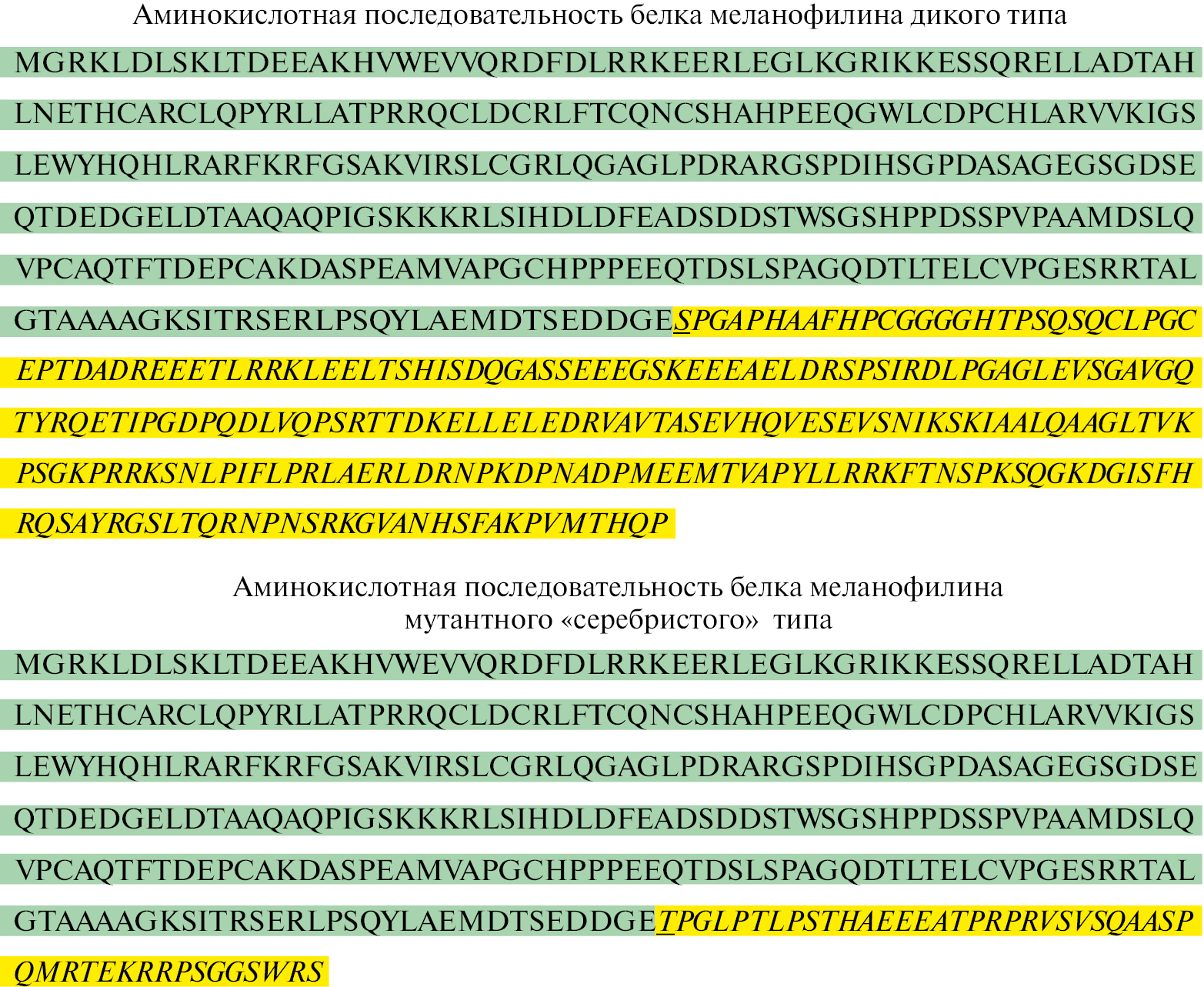 Рис. 2. Сравнение аминокислотных последовательностей дикой и мутантной форм меланофилина. Для наглядности мы выделили одинаковые у двух форм последовательности аминокислот зеленым цветом, а различающиеся – желтым и курсивом. Первая измененная аминокислота выделена также подчеркиванием.